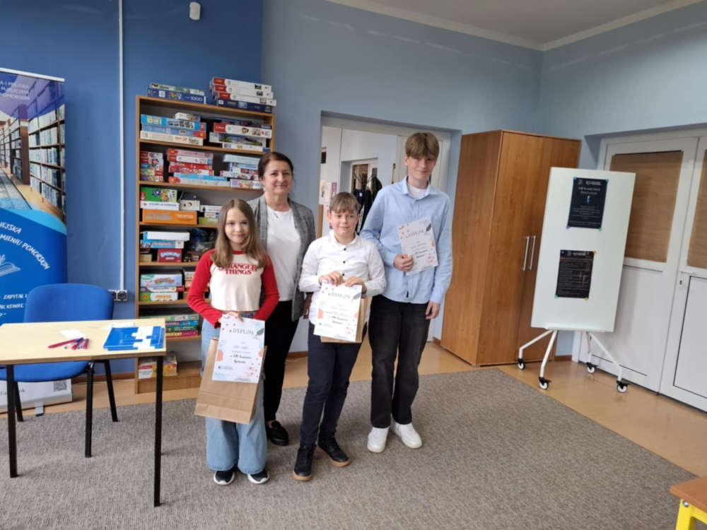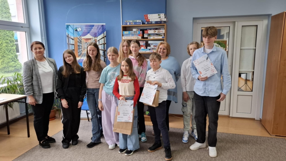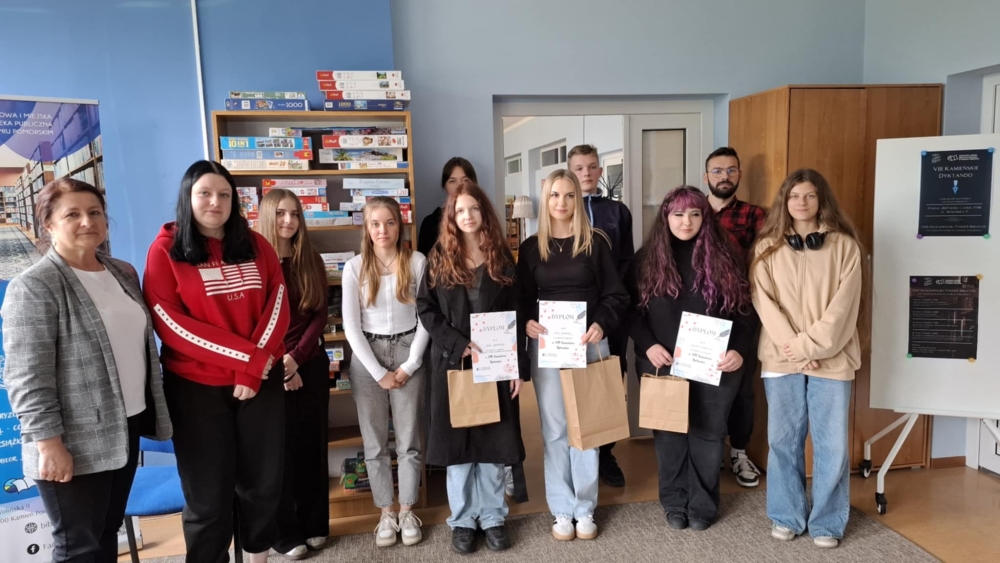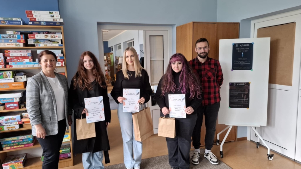 Tegoroczne obchody Tygodnia Bibliotek w Powiatowej i Miejskiej Bibliotece Publicznej w Kamieniu Pomorskim zakończyło Wielkie Kamieńskie Dyktando. 19 maja, po raz ósmy, w szranki z zawiłościami pisowni języka polskiego stanęli młodsi i starsi mieszkańcy naszego miasta. Zadaniem uczestników było napisanie podyktowanego tekstu z jak najmniejszą liczbą błędów ortograficznych i interpunkcyjnych. Dyktando przeprowadzono w czterech grupach wiekowych. Pierwsza grupa to uczniowie klas IV-VI, druga grupa to uczniowie klas VII-VIII szkół podstawowych, trzecia to uczniowie szkół średnich, zaś ostatnia to dorośli. Jest nam niezmiernie miło poinformować , że wśród najmłodszej grupy trzecie miejsce zajął Jakub Interewicz (Szkoła Podstawowa nr 1), drugie miejsce zajęła Oliwia Szynka (Szkoła Podstawowa nr 2), a tytuł Kamieńskiego Małego Mistrza Ortografii zdobył Miłosz Mazurek (Szkoła Podstawowa nr 1). W grupie drugiej trzecie miejsce zajęła Martyna Skierska , drugie miejsce Kaja Piekarz, Mistrzem Ortografii została Julia Kuryś. Wszystkie laureatki są uczennicami Szkoły Podstawowej nr 2. W grupie trzeciej , trzecie miejsce zajęła Lilianna Kazanecka z Liceum Ogólnokształcącego, drugie miejsce Nina Zaliwska z Liceum Ogólnokształcącego, zaś Mistrzynią Ortografii została Alicja Grabowska z Zespołu Szkół Ponadpodstawowych. W grupie dorosłych trzecie miejsce zajął pan Krzysztof Kulka, drugie miejsce pani Justyna Cieszyńska, Kamieńskim Mistrzem Ortografii 2025 została pani Olga Skotarek. Wszystkim laureatom serdecznie gratulujemy!