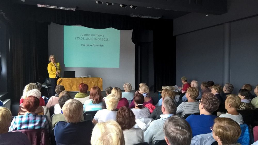 Powiatowa i Miejska Biblioteka Publiczna w Kamieniu Pomorskim gościła panią Cecylię Judek z Książnicy Pomorskiej, która przyjechała 24 kwietnia z wykładem dla członków SUTW w Kamieniu Pomorskim. Studenci Uniwersytetu Trzeciego Wieku wysłuchali bardzo ciekawego wykładu o Joannie Kulmowej, najpopularniejszej poetce zachodniopomorskiego regionu, która przez 35 lat mieszkała wraz z mężem w Strumianach. Po wyprowadzeniu się do Warszawy ofiarowali Bibliotece Głównej Uniwersytetu Szczecińskiego liczne pamiątki (obrazy, zabytkowe meble, książki), wykorzystane przy stworzeniu tzw. Sali Strumiańskiej, będącej miejscem spotkań autorskich, promocji książek, wydarzeń kulturalnych. Po raz kolejny mieliśmy okazję przekonać się, że pani Cecylia potrafi o literaturze i historii mówić w sposób zajmujący i pełen pasji, zdradzając słuchaczom wiele ciekawostek z życia bohaterki wykładu. Joanna Kulmowa była poetką, prozaiczką, librecistką, tłumaczką (tłumaczyła z 7 języków), aktorką i inscenizatorką teatralną, autorką dramatów, słuchowisk radiowych, utworów satyrycznych, piosenek, oratoriów, misteriów religijnych oraz książek dla dzieci i młodzieży. Wisława Szymborska napisała o niej "przyjaciółka moja i poetka grubo niedoceniana".